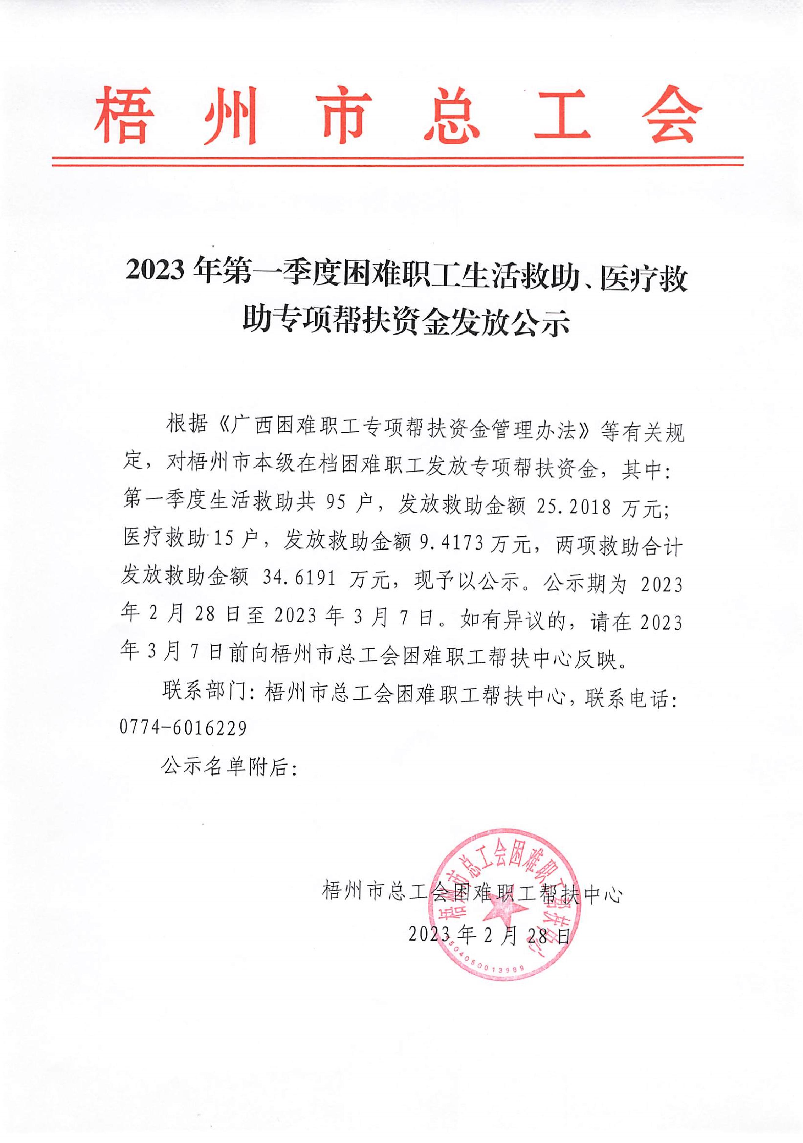 2023年第一季度困難職工生活救助、醫(yī)療救助專項(xiàng)幫扶資金發(fā)放公示