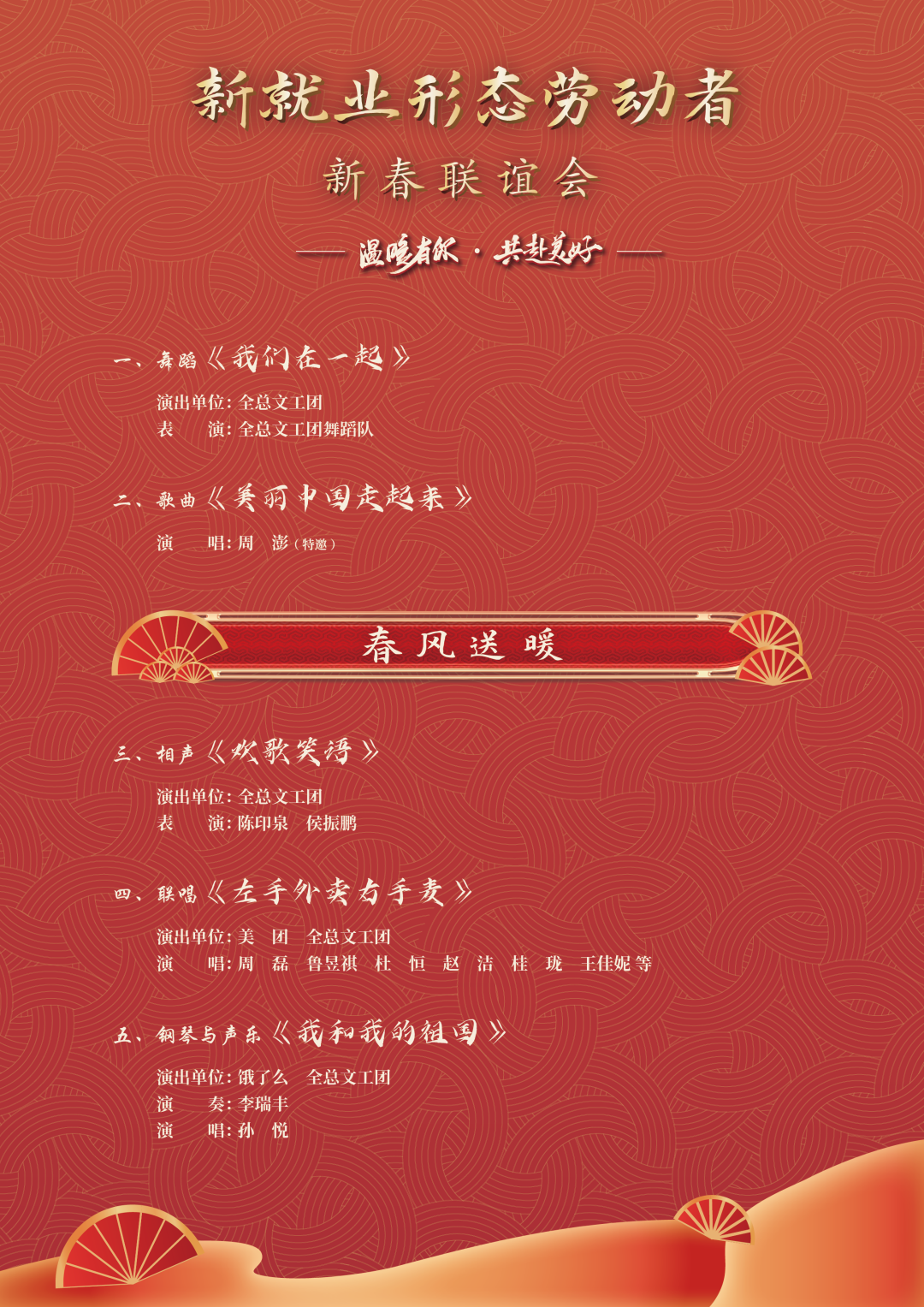 此次活動(dòng)以“溫暖有你 共赴美好”為主題,突出喜慶、溫暖、美好的主基調(diào),分為“春風(fēng)送暖、關(guān)愛情暖、新春心暖”三個(gè)篇章,通過(guò)文藝工作者與新就業(yè)形態(tài)勞動(dòng)者同臺(tái)演出的聯(lián)誼活動(dòng),讓廣大職工感受到“娘家人”的關(guān)心和節(jié)日的溫暖,是在農(nóng)歷春節(jié)即將到來(lái)之際,面向全體新就業(yè)形態(tài)勞動(dòng)者和全國(guó)廣大職工開展的一次文化送溫暖活動(dòng)。